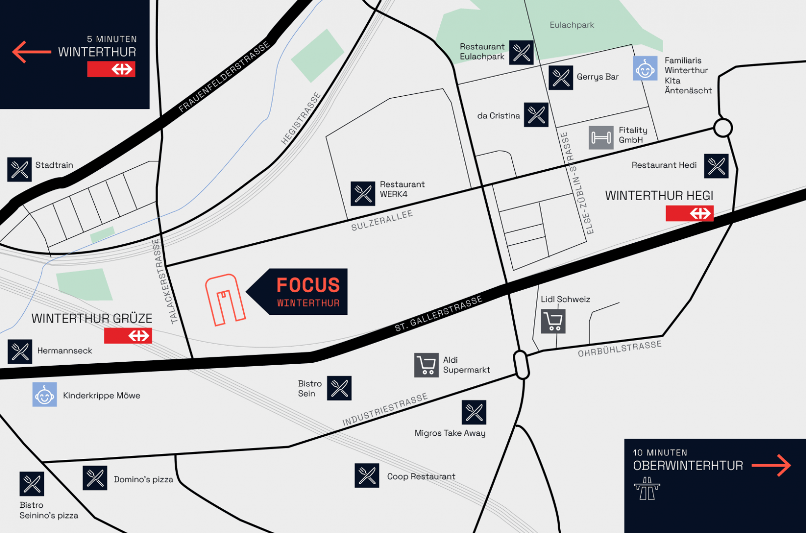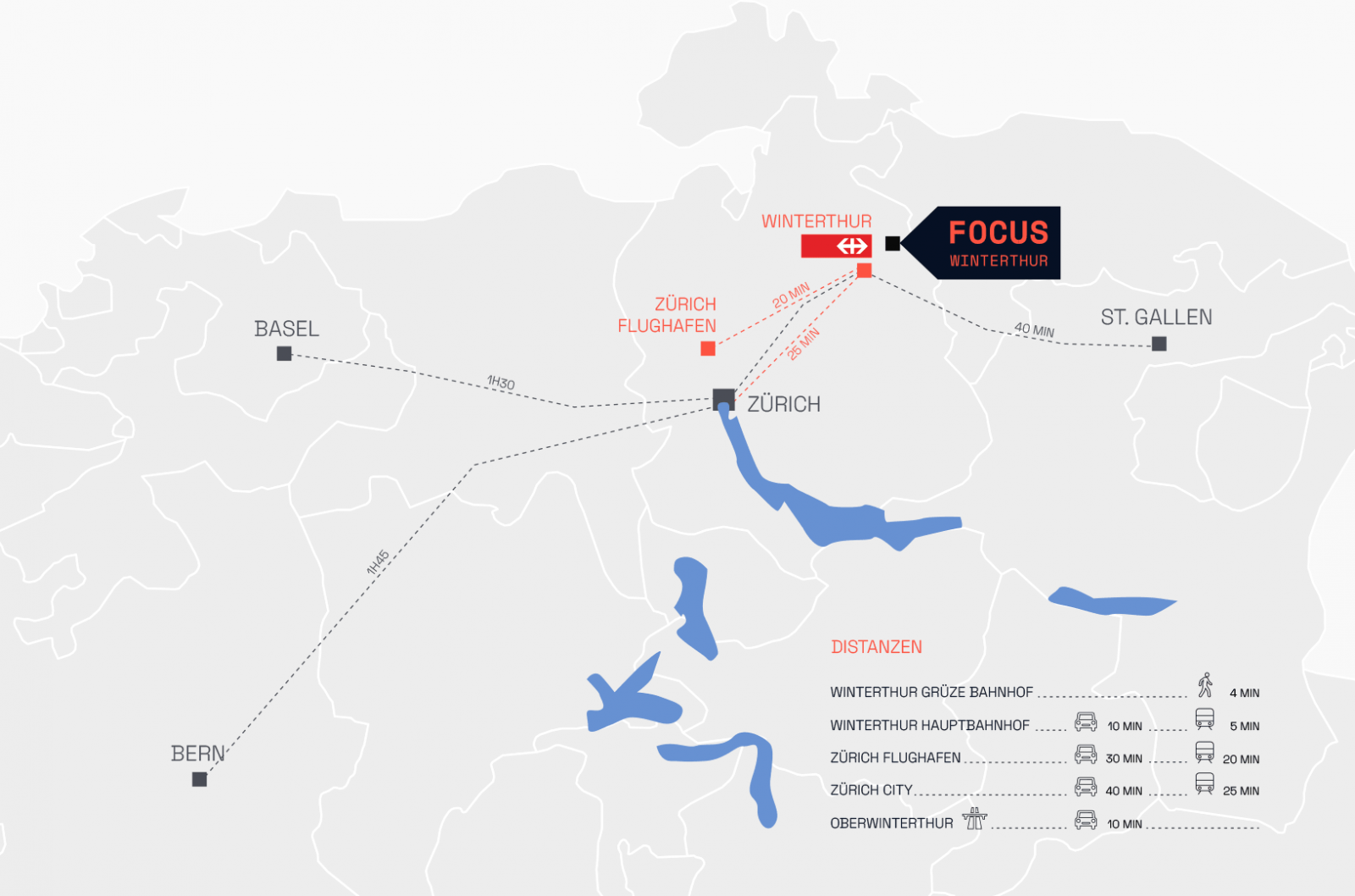 Winterthur wächst. Darum entsteht im Osten das zweite urbane Zentrum. Das Focus ist wenige S-Bahn-Minuten vom Bahnhof Winterthur oder Fahrminuten von den Autobahnanschlüssen Oberwinterthur und Töss entfernt.